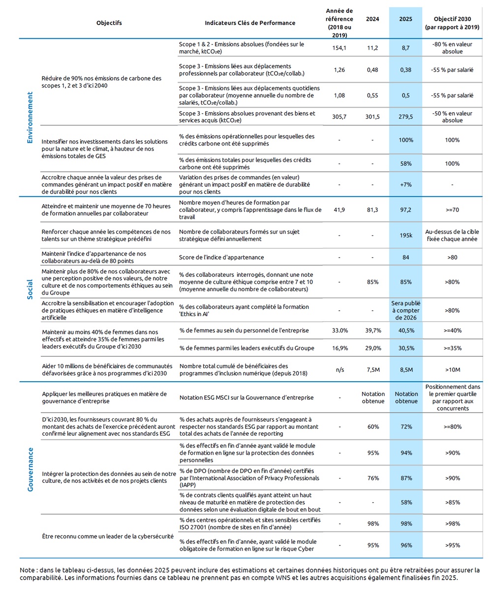 Note : dans le tableau ci-dessus, les données 2025 peuvent inclure des estimations et certaines données historiques ont pu être retraitées pour assurer la comparabilité. Les informations fournies dans ce tableau ne prennent pas en compte WNS et les autres acquisitions également finalisées fin 2025.