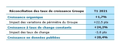 La dynamique du Groupe a continué de se renforcer au 1er trimestre 2021, avec des taux de croissance annuels supérieurs à ceux observés au dernier trimestre de 2020. Avec un retour à la croissance à taux de change et périmètre constants dès le 1er trimestre, qui s’élève à +1,7%, le chiffre d’affaires du Groupe s’inscrit déjà en progression par rapport au niveau d’avant crise.
