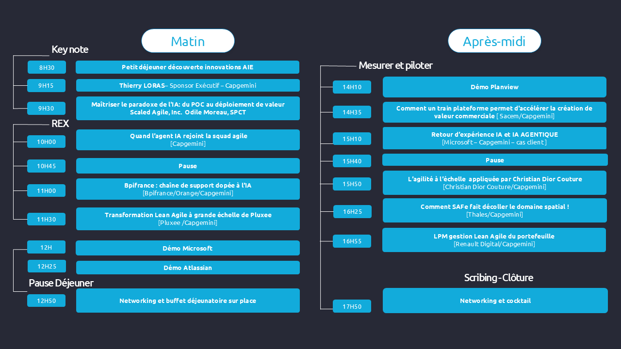 Tout au long de la journée, vous aurez l’opportunité d’écouter des témoignages exclusifs d’acteurs majeurs de la transformation : Scaled Agile Inc, Bpifrance, Pluxee, Sacem, Christian Dior Couture, Thales, Microsoft, Renault Digital, et bien d’autres encore.