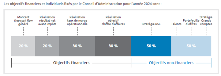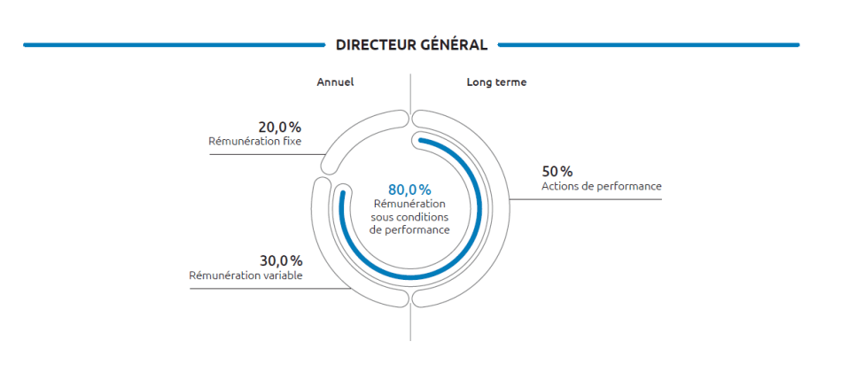 Dans le respect des bonnes pratiques et déterminée selon des critères clairs et quantifiables, la politique de rémunération du Directeur général comprend des incitations qui reflètent l’orientation stratégique du Groupe sur la croissance durable à long terme, avec une rémunération variable et à long terme liée en partie aux critères de RSE.