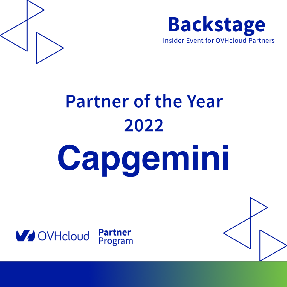 Capgemini a été consacré, pour la deuxième année consécutive, «Partner of the Year » en reconnaissance d’un partenariat solide de plus de 5 ans alliant les capacités de service et d’infrastructures d’OVHcloud et le savoir-faire de Capgemini pour accompagner nos clients.