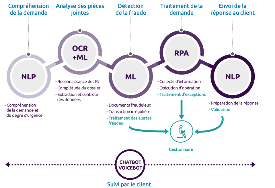 Un processus de traitement de demandes clients (voir illustration) peut ainsi être automatisé très en profondeur : depuis la compréhension de la demande reçue par la voix ou par mail, l’exploitation et le contrôle des justificatifs, la détection de fraude, l’exécution et le retour au client. Les solutions se positionnent généralement dans une logique d’augmentation plus que de substitution des humains : elles peuvent générer des alertes ou tâches de contrôles pour lesquelles l’expertise humaine reste nécessaire. A ce titre, il est souvent extrêmement utile d’associer à l’IA une solution de Business Process Management pour orchestrer les interactions entre machine et humain et avoir un monitoring bout en bout.