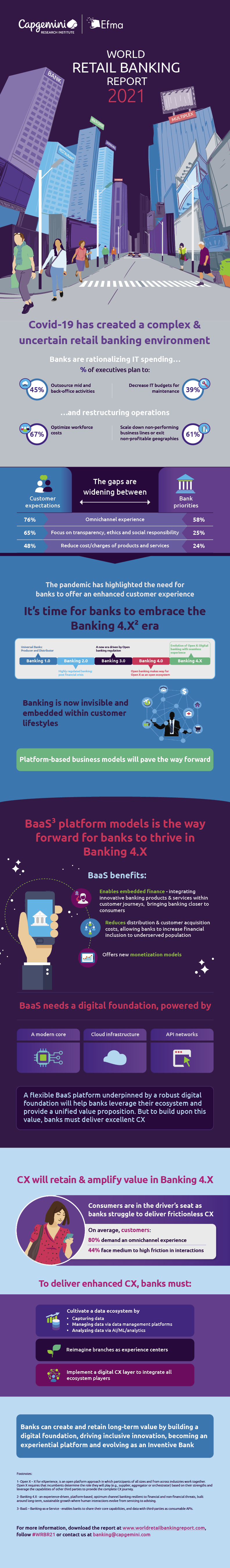 Selon le World Retail Banking Report 2021 (WRBR) publié aujourd’hui par Capgemini et l’Efma, les banques de détail sont confrontées à un dilemme : aligner leurs offres sur les attentes des clients ou courir le risque de les perdre. Tandis que les conséquences économiques de la crise Covid-19 se font encore ressentir, la pandémie a ouvert une nouvelle ère bancaire centrée sur la valeur et le client, désignée sous le terme de Banking 4.X dans le rapport. Elle implique que les banques entreprennent une transformation digitale et mettent en place des plateformes « Banking-as-a-Service »1 (BaaS), basées sur le cloud, qui utilisent des API2 pour intégrer la banque dans le quotidien de ses clients, la rendant ainsi plus accessible et plus inclusive.