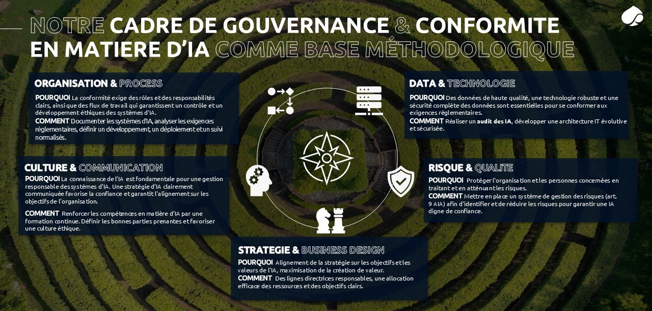 Par conséquent, les organisations et les dirigeants d’entreprise doivent pouvoir déployer des processus et méthodes éprouvés et efficaces conformes à l’AI Act pour le développement et l’utilisation de leurs IA. Notre cadre de gouvernance et de conformité de l’IA offre une approche structurée pour soutenir nos clients. Nous allons au-delà de la gestion des risques et des processus pour fournir une vision holistique qui inclut la culture et la stratégie.