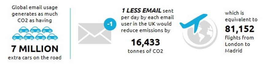 Every minute spent scrolling a newsfeed, browsing the internet, streaming a video all contribute to our digital carbon footprint. Global email usage generates as much CO2 as having 7 million extra cars on the road. If each email user in the UK sent 1 less email per day, we could reduce emissions by 16,433 tonnes of CO2; the equivalent of 81,152 flights from London to Madrid.