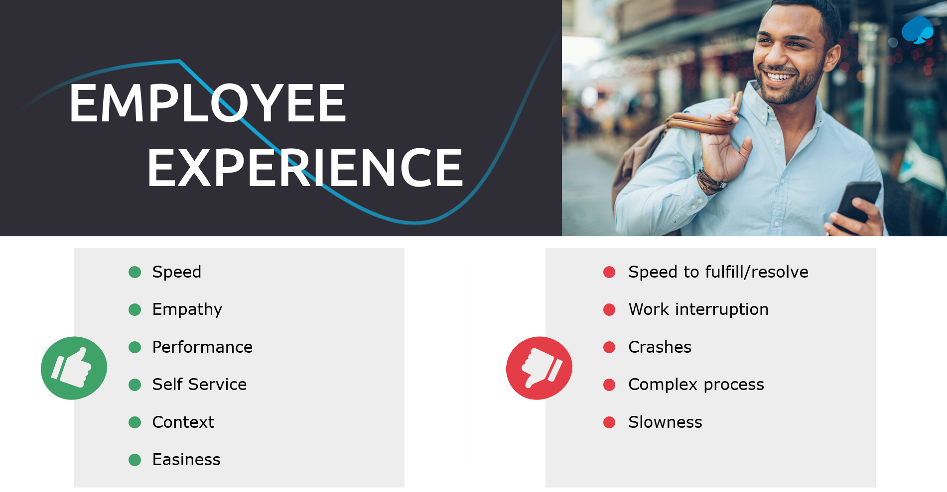 We do know that employee experience can be affected in many ways: work interruptions, network slowness, system or application crashes, complex support procedures, the inability to find required information, or unexpected automations can adversely impact employee experience. Conversely, simple, rapid, and straightforward services can positively influence employee happiness.