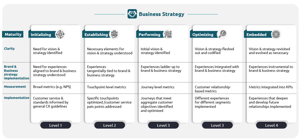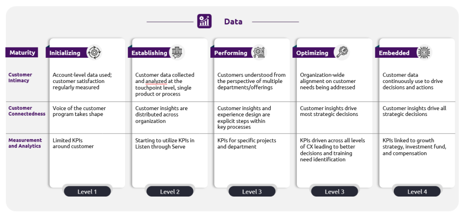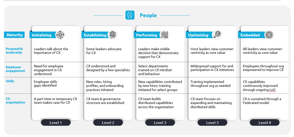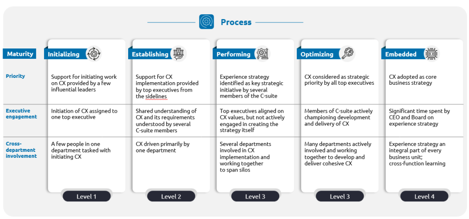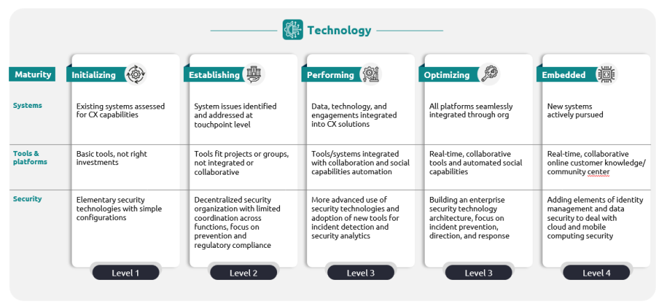 Banks can gain valuable insights into their CX maturity by assessing five essential components – people, process, data, technology and business strategy. Below is a comprehensive framework which banks can leverage as guiding principles to measure their CX maturity against these five pillars: