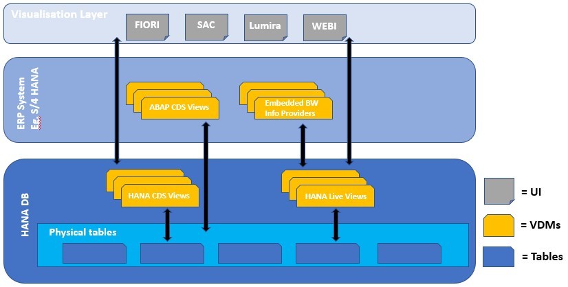 ABAP CDS Views come with a long list of SAP standard content which can be used as is or within other ABAP CDS views or ABAP programs to create VDMs. These VDMs can be consumed in Embedded Analytics, Fiori, SAP Analytics Cloud (SAC) , Lumira or BusinessObjects reporting.