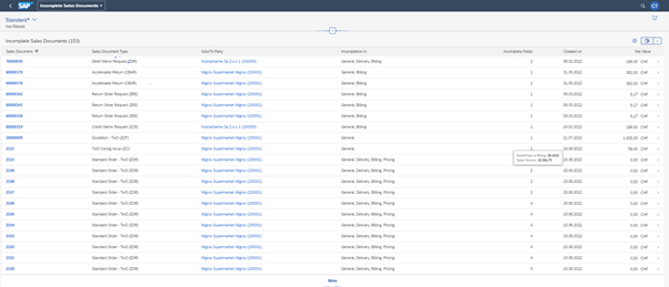 By double clicking on the incomplete sales document tile, the user will be taken to the list of incomplete sales documents that they can drill further into and correct.