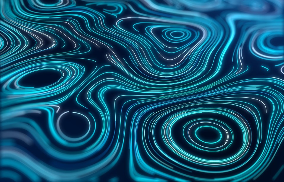 Abstract digital artwork with pixelated blue and green wave-like patterns creating a sense of movement and depth.