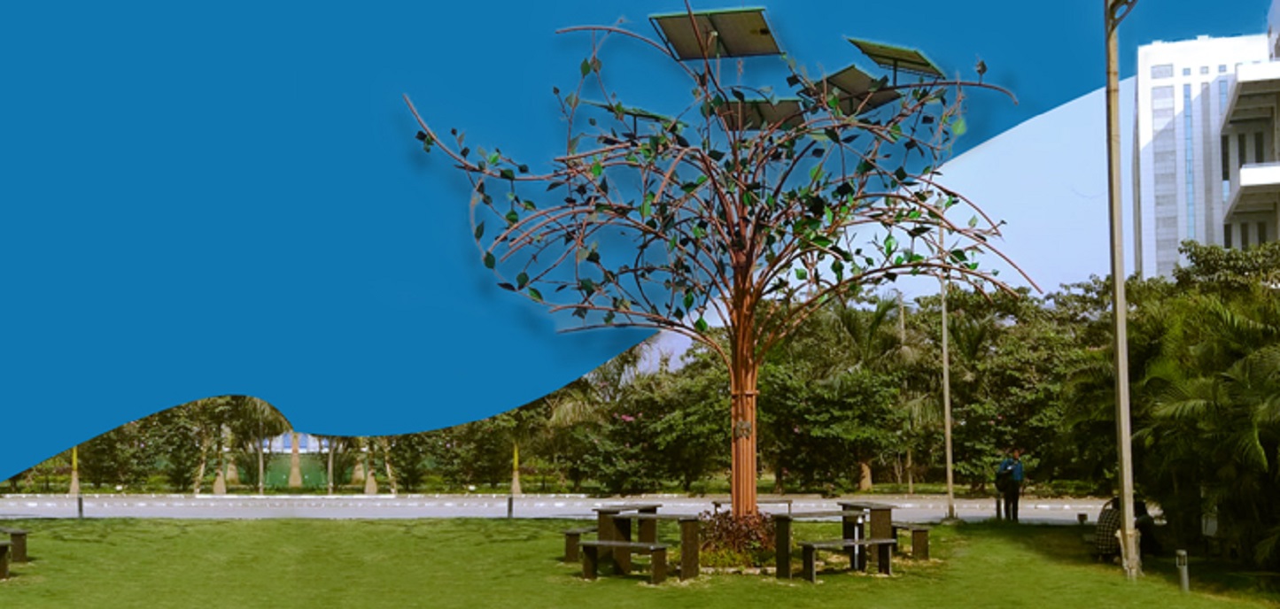The solar-powered trees are artificial structures topped with solar panels. These offer shade and benches for people where they can chat, relax, and hold informal meetings while, at the same time, powering their laptops and phones via the solar canopy above.