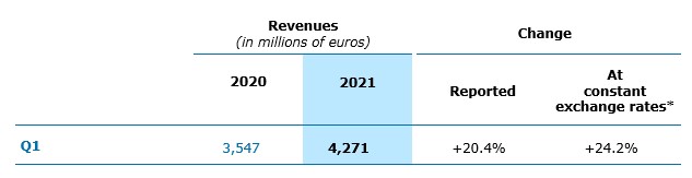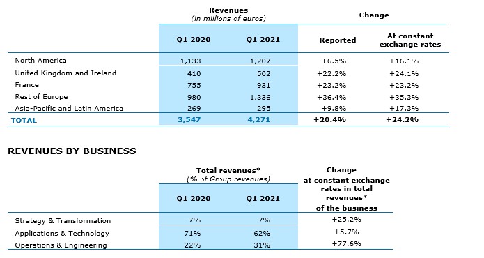 Paris, April 29, 2021 – Capgemini Group reported Q1 2021 revenues of €4,271 million, up 24.2% year-on-year at constant exchange rates*.