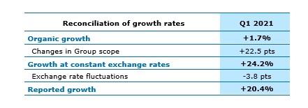On an organic basis, the North America (28% of Group revenues) and Rest of Europe (31% of Group revenues) regions returned to growth. Growth accelerated in Asia-Pacific and Latin America (7% of Group revenues) and United Kingdom and Ireland (12% of Group revenues), climbing to double figures in the latter region. Finally, France (22% of Group revenues) continued its gradual recovery, although it was still down on Q1 2020.