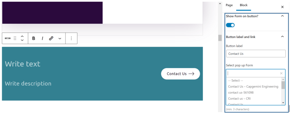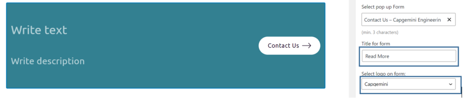 • New Feature: You can now add a form to the CTA button. All you need to do is enable the Show Form on button toggle, choose the form under the section Select the pop-up form, provide a title to the form in the field Title for form and finally from the Select logo on form dropdown, choose the logo. Refer to the screenshots below.