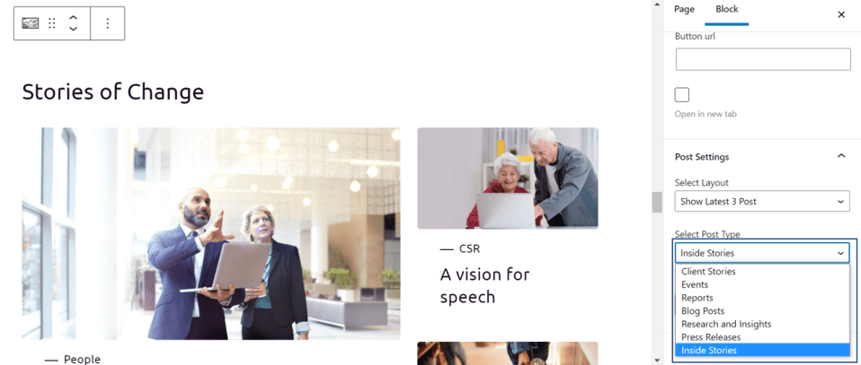 The block has now been upgraded to pull data from any of the post-type pages including Client Stories, Events, Reports and more. The block can display either 3 or 4 recent posts depending upon your choice.