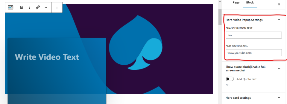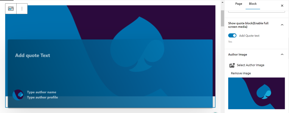 • “Show quotes” creates a space on the block to add a quote and you can also add the image of the author