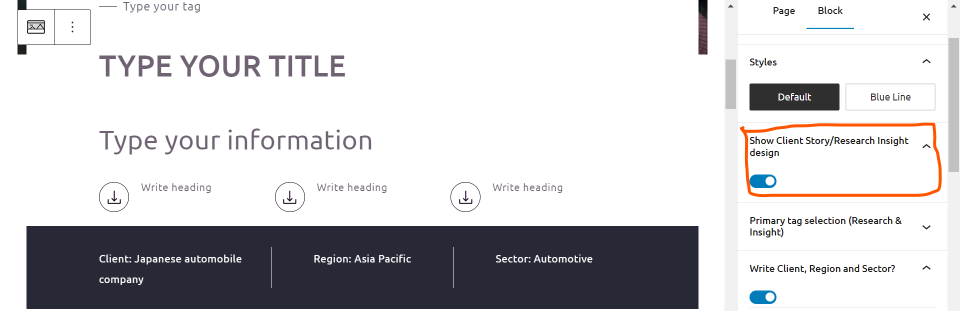 • Also, if you are creating a client story or research and insights you can always use the the toggle and enable more options