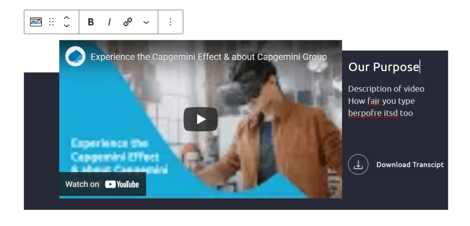 This block supports YouTube videos. Using the Intro Para (Video) block, you can add YouTube videos to the web pages on your website. Using the block, you can also add a title and a description for your video.