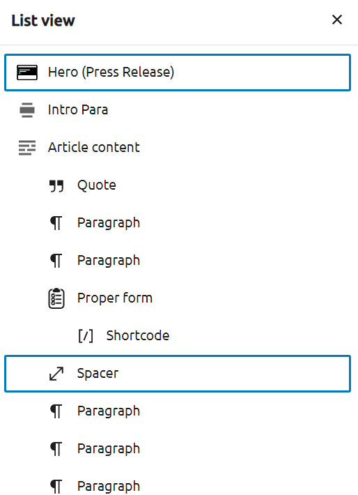 • The Shortcode block is used in the archive pages. Here the text in the Shortcode block pulls the data from the Press Releases post pages.