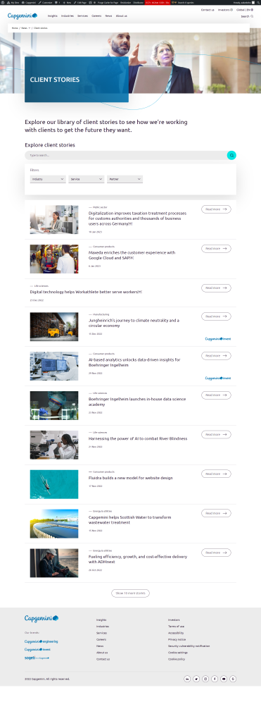 ​All client stories are contained in a single location, providing a searchable repository, and enabling publication across the site. ​ They can be automatically featured on other pages, pulled through by virtue of the taxonomy. ​