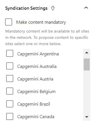 For each page there is a need to syndicate pages for the local website. Hence, if you want to showcase a particular page/category, there is a need to check the dropdown for the same.  Before that, please check if the page is approved for syndication.