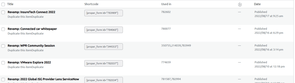 While the Development team import database from Global to local website, the Forms also are carried in the database and hence, you will have a complete list of prepared forms. You may check them from the backend, under “Forms” section.