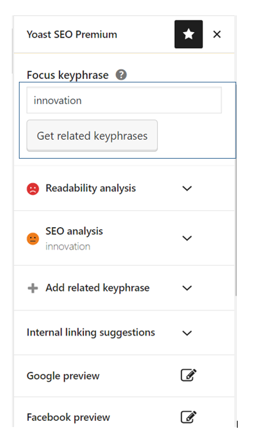 After you are done with your keyword research you can use the Focus keyphrase tool to set a focus keyphrase for an article in Yoast SEO. Setting the Focus keyphrase will help you optimize your posts and pages for the keywords or keyphrases you want them to rank for. You can also click on the Get related keyphrases button to get the related keywords and optimize your posts and pages more efficiently.