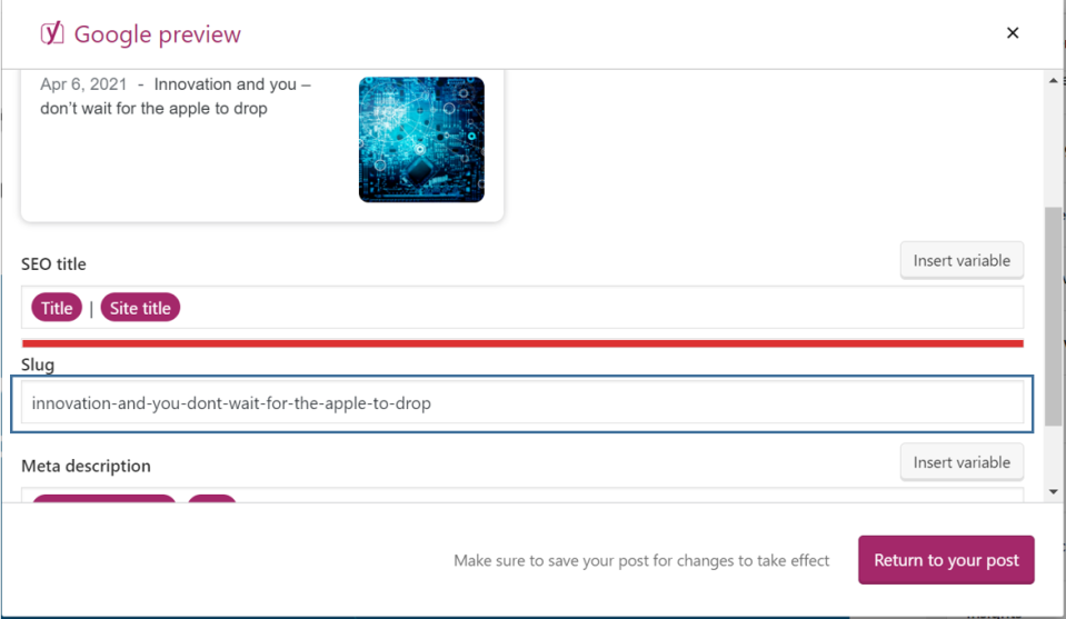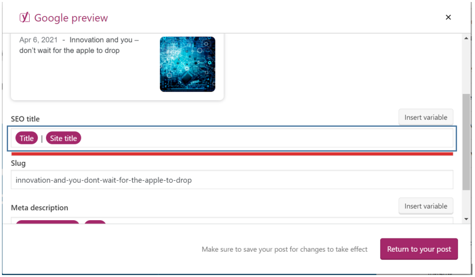 In Yoast SEO, Google preview will provide you with an idea with respect to how your posts will look in the Google search engine and how your viewers will see them. This will help you to make your content stand out on Google. You can set a specific title, add a slug and create the meta description. Also, if you want, you can set one standard structure for all of your posts.