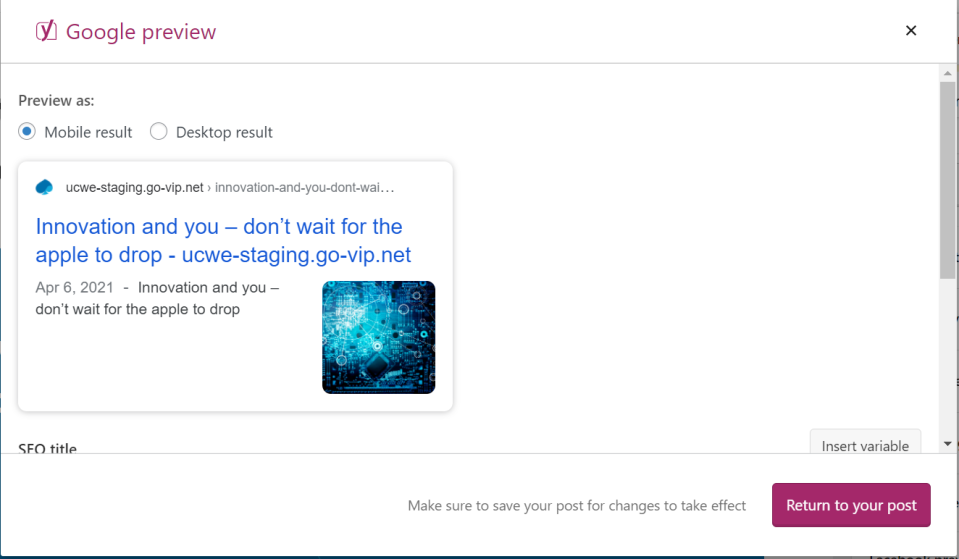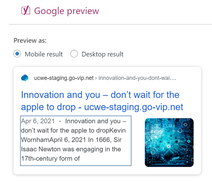 Yoast SEO premium comes loaded with Google Preview and Social Media previews (Usually Facebook and Twitter). Using the previews feature, you can optimize your posts to attract your target and potential viewers.  With Google and Social Media previews you will have the flexibility to change the image, title and description for Google as well as Facebook and Twitter. While Yoast SEO will handle all of the technical details of sizes, formats and layouts for you.