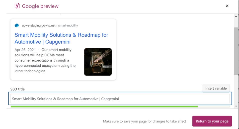 For individual pages, you have to manually create an SEO title for Google Preview. You need to include keywords in the title and then at the end include a pipe separator to add the Site title Capgemini.