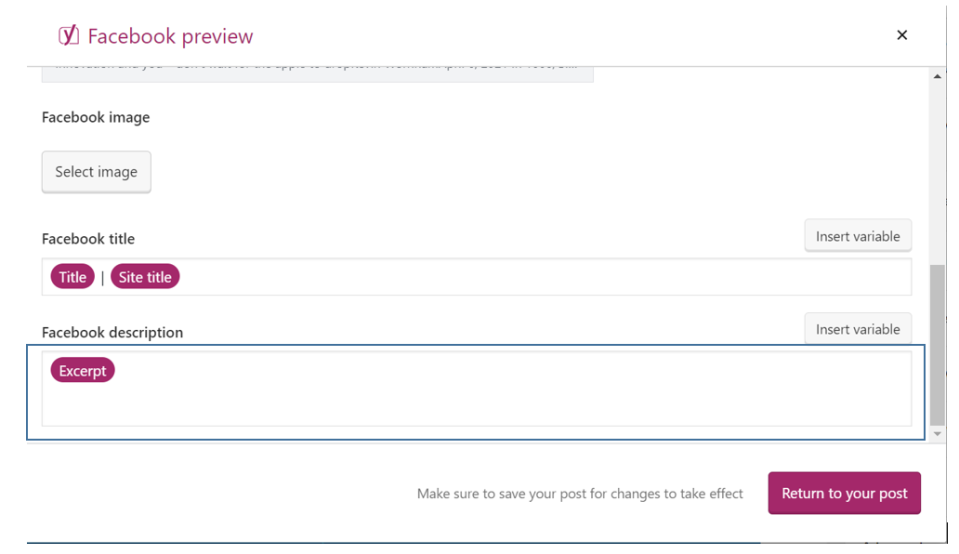 In the Facebook description field, you need to insert an excerpt, and the description for the post will be automatically created.