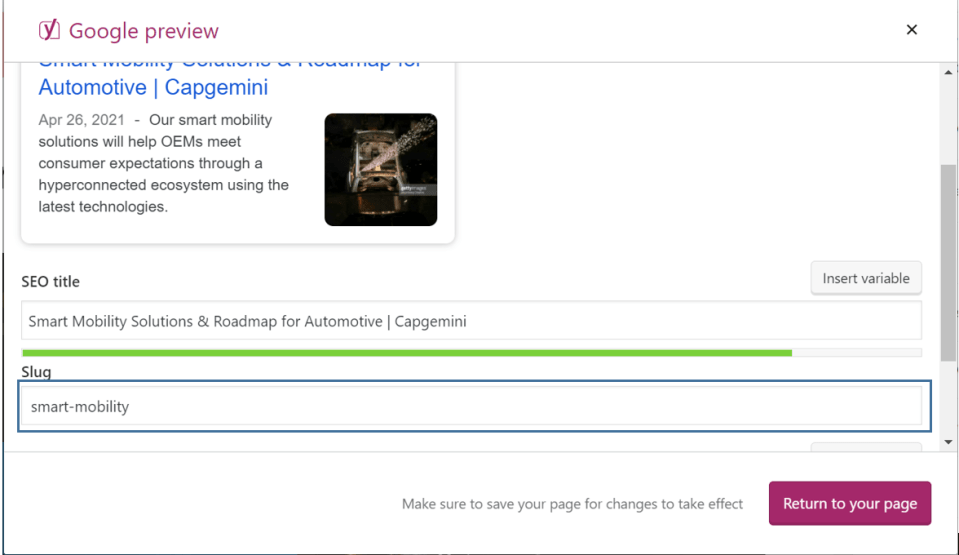 For eg: below is the SEO title for the industry (Smart Mobility) page. Here the title has been created using the keywords listed below and is followed by the Site title Capgemini.