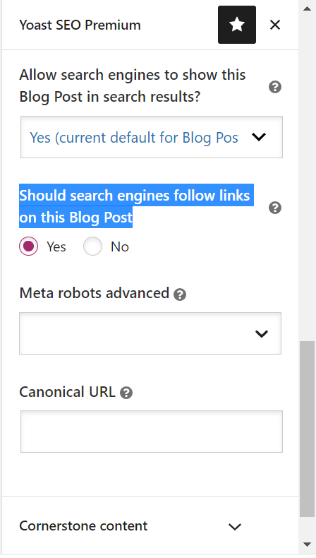 In the advanced features tab of Yoast SEO, you can allow or block search engines from following links in a post or a page, by selecting the Yes or No radio buttons.