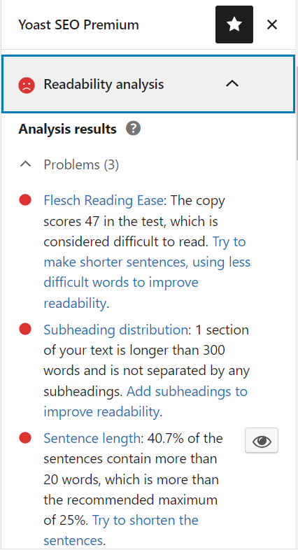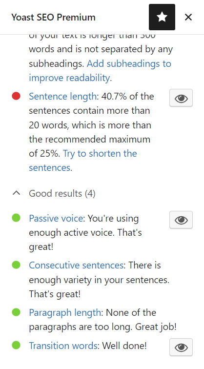 With readability analysis, you can optimize your content in a way that your readers can easily understand it. Readability analysis will check your content for various parameters including reading ease, sentence length, passive voice used, etc. and will show the results in the form of red, orange and green bullets to indicate how every factor scores. You need to edit your content accordingly and make all the bullets green. Refer to the screenshots below.