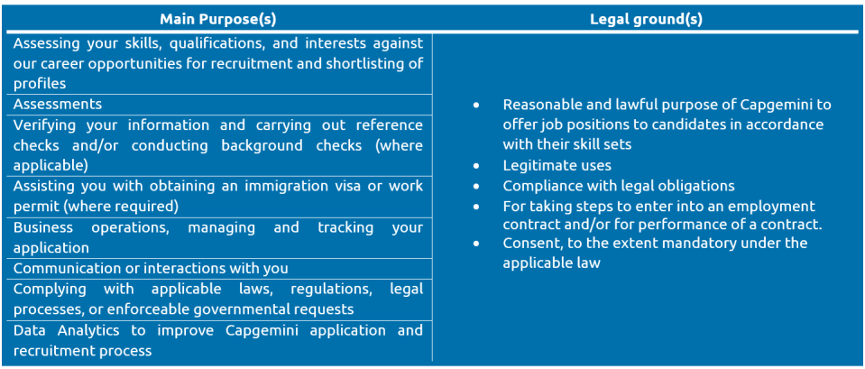 Capgemini is collecting and further processing your Personal Data for several reasons, each of which is based on a specific legal ground as defined hereunder: