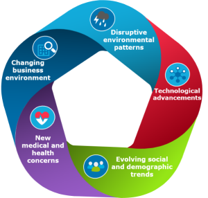Let me share a few key highlights from our analysis. WIR 2019 classifies the drivers behind risk landscape changes into five macro trends: disruptive environmental patterns, technological advancements, evolving social and demographic trends, new medical and health concerns, and the changing business environment.