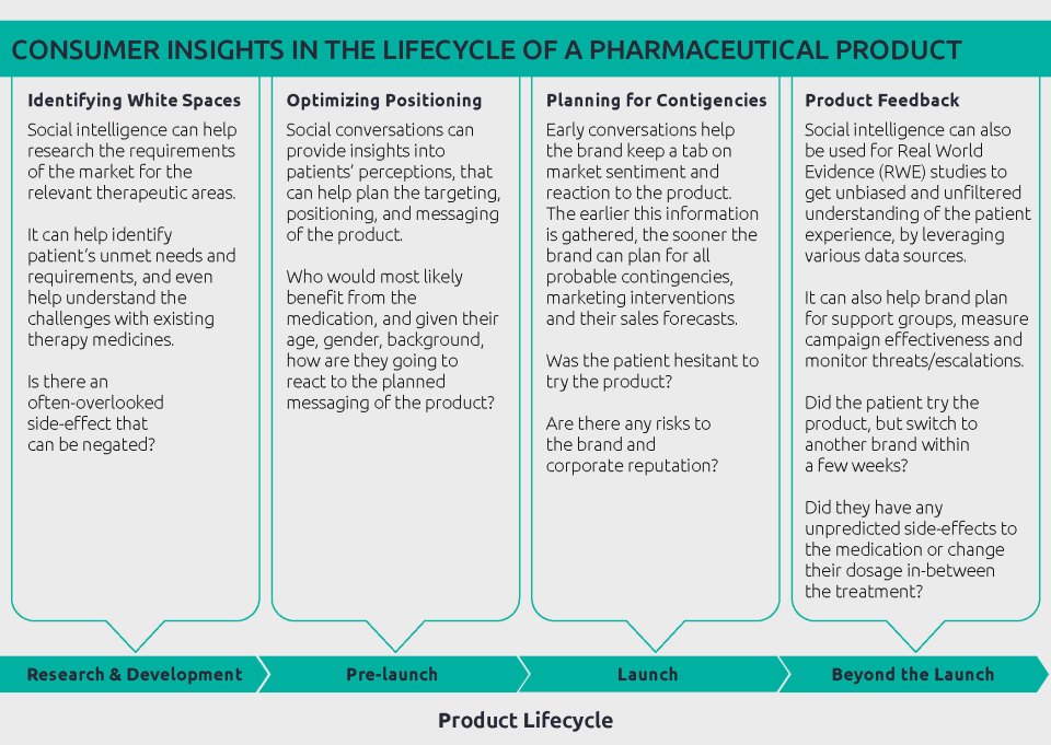 For example, in the case of a pharmaceutical company launching a new drug ‒ social intelligence would help understand the needs of the patient, their journey, high-traction channels, competitiveness of the market and market opportunities.