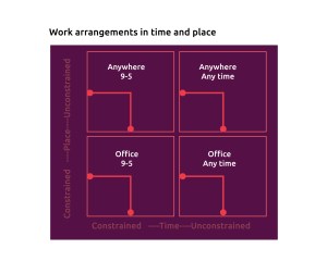 Constrained, inflexible hours aid coordination since colleagues’ time can be easily synchronized. But it depletes focus because it fails to respond to individual rhythms of concentration. Similarly, different roles tend to be more suited to different areas on the time/place axes.