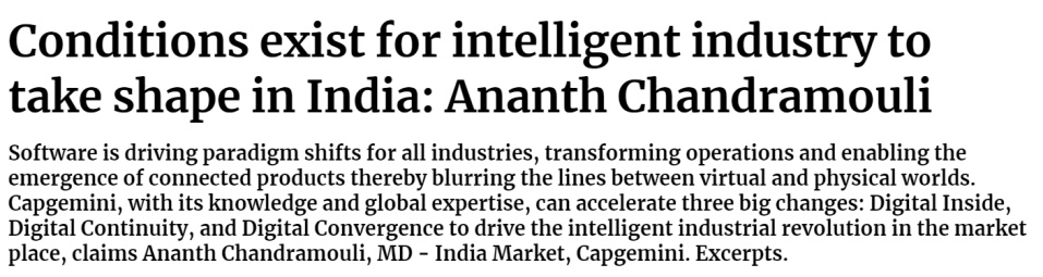 Read an insightful piece on intelligent industry as Ananth Chandramouli, Executive Vice President and Managing Director India Business Unit, Capgemini highlights conditions that will drive it’s growth in India.