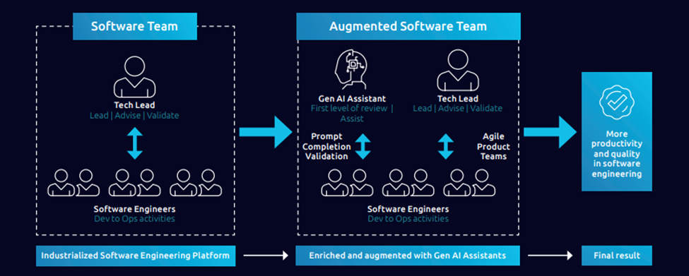 AI-augmented software teams integrate human expertise with advanced AI capabilities to enhance every stage of the software development lifecycle. Developers work alongside Gen AI, using prompt engineering and automated code completion while maintaining creativity. Team members review each other’s outputs, and senior developers provide final validation, ensuring quality, smooth workflows, and effective team dynamics.