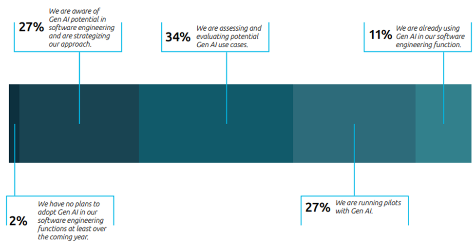 The concern that generative AI will replace software engineers has not materialized. Only 4% of organizations intend to reduce headcounts using Gen AI. Instead, companies are using it to create opportunities: