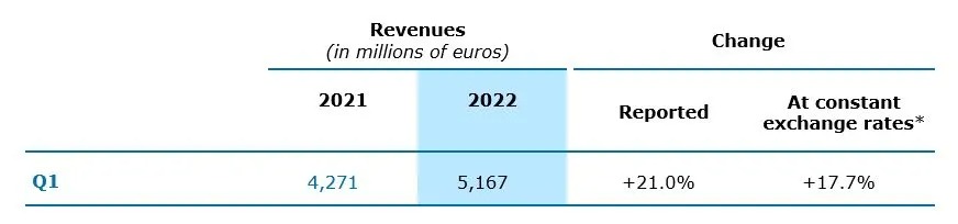 Paris, April 28, 2022 – The Capgemini Group reported Q1 2022 revenues of €5,167 million, up 21,0% year-on-year at current exchange rates and 17.7% at constant exchange rates*.