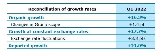 The Group’s activity experienced a further acceleration in Q1 2022, with growth of +17.7% at constant exchange rates*. The pace of growth has indeed strengthened compared to the 12.5% observed in Q4 2021, across all regions and sectors. Organic growth (i.e. adjusted for Group scope and exchange rates) reached +16.3%, up 3.1 points on Q4 2021.