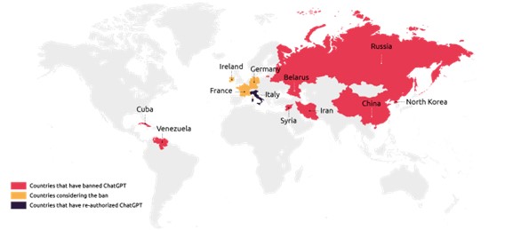 Several countries have decided to ban ChatGPT (see Figure 3). Most of them (Russia, North Korea, Iran, etc.) have done so for reasons of data protection, information control, or concerns around their rivalry with the USA. Some Western countries, such as Italy, have banned it and then reauthorized it, while others are now considering a ban. For the latter, the reasons cited are cybersecurity, the protection of minors, and compliance with current laws (e.g., GDPR).