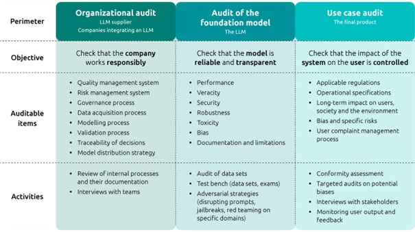 An organizational audit can be carried out to check if the company developing the LLM is working responsibly, along with ensuring, for example, that its processes and management systems are compliant.