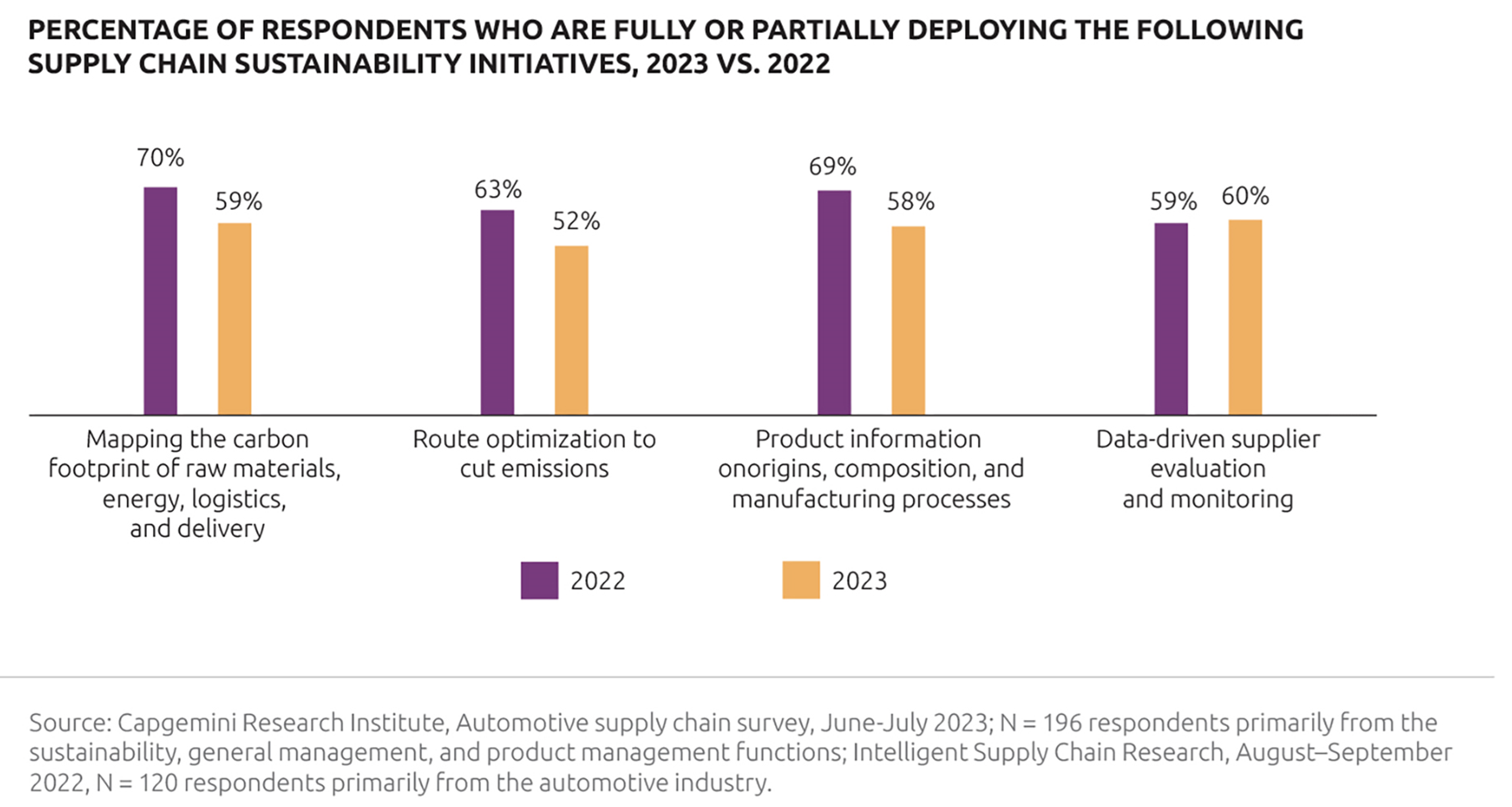 A recent Capgemini Research Institute (CRI) report on the automotive supply chain revealed that automotive sustainability has taken a back seat over the past few years, while companies struggled to mitigate short-term supply chain problems arising from the pandemic and subsequent geopolitical shocks. The figure below illustrates that this trend has continued during 2023.