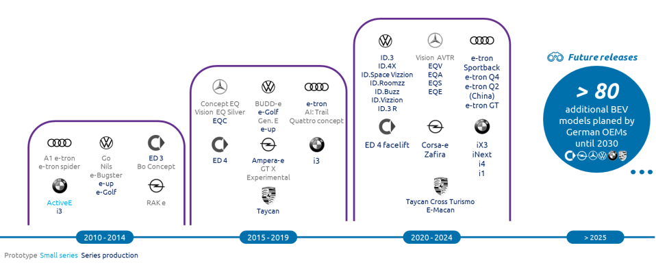 BEV models launched or planned by German OEMs between 2010 and 2025