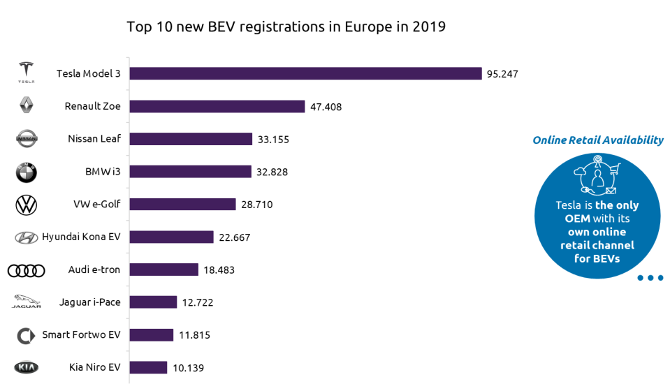 Even though customers are increasingly demanding an online sales process to be end to end, the COVID-19 shutdowns around the globe have revealed a distinct gap: Tesla is the only OEM with its own full online retail availability for BEVs in Europe, offering an easy sales process with solely six clicks. With the digital sphere in mind, Tesla tightly controls the customer experience and creates high service standards. Consumers can access information and order products, with customization and financing options from Tesla’s website, without the need for human intervention. The other OEMs lack behind, not only in terms of superior experience but also in numbers of new BEV registrations.
