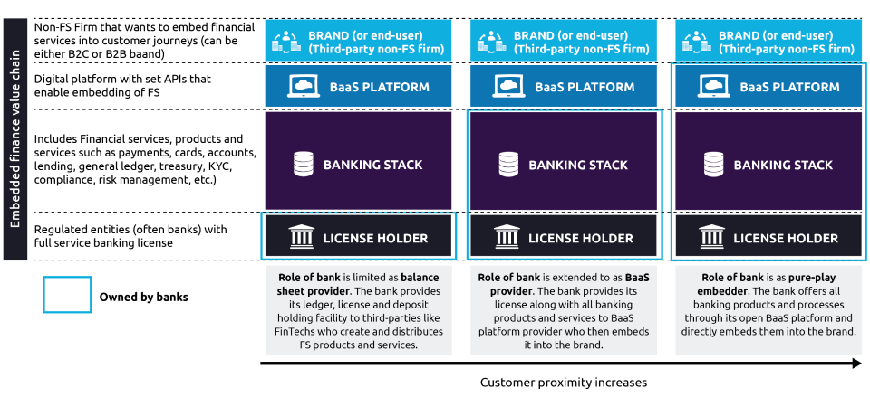The advent of Open Banking allowed for new business model innovations. A key manifestation of open banking revolution is embedded finance – a business model that structurally separates the banking back-end operations from customer interface, making finance (payments, lending, banking) invisible and contextual for end users. Over the years, the embedded finance model has evolved (Figure 1), from banks being only the back-end rails to banks actively owning the CX and improving customer proximity through embedded finance.
