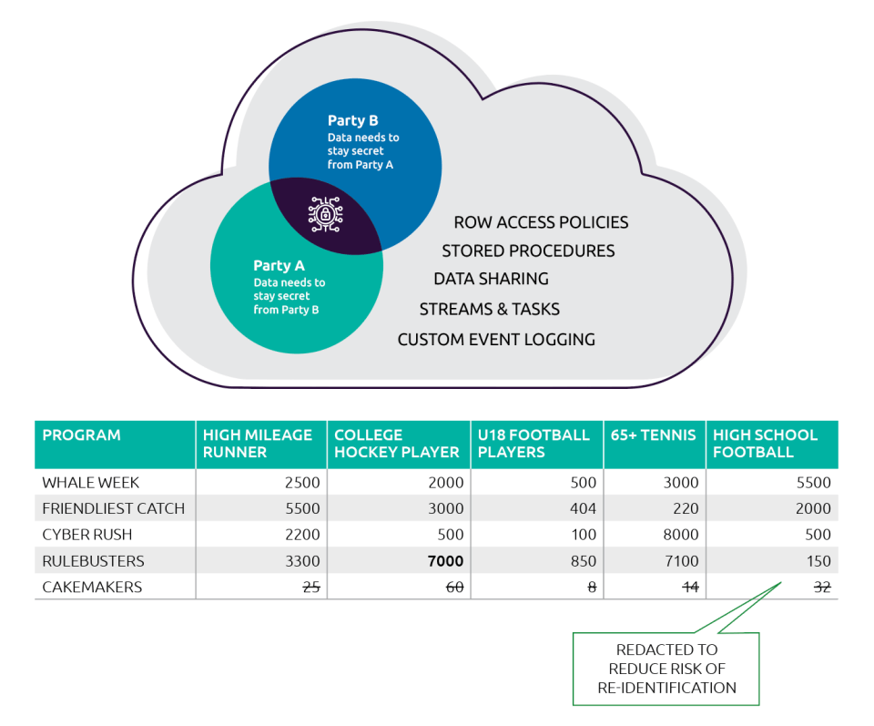In a real use case, commonly seen in media and advertising these days, brands want to optimize their ad spend through better targeting to specific customers or personas – like the fans watching that exciting game. Media outlets want to offer premium placements by knowing exactly which programming the brand’s customers are watching. Comparing customers is a win-win. However, neither wants to show the underlying data. The clean room allows them to share without showing. In this case, as illustrated in the diagram, the returned information would include a customer count for each of the media outlet’s programs, but not specific customer data, in order to ensure compliance with privacy regulations. All queries of the data would be monitored and logged for audit purposes.